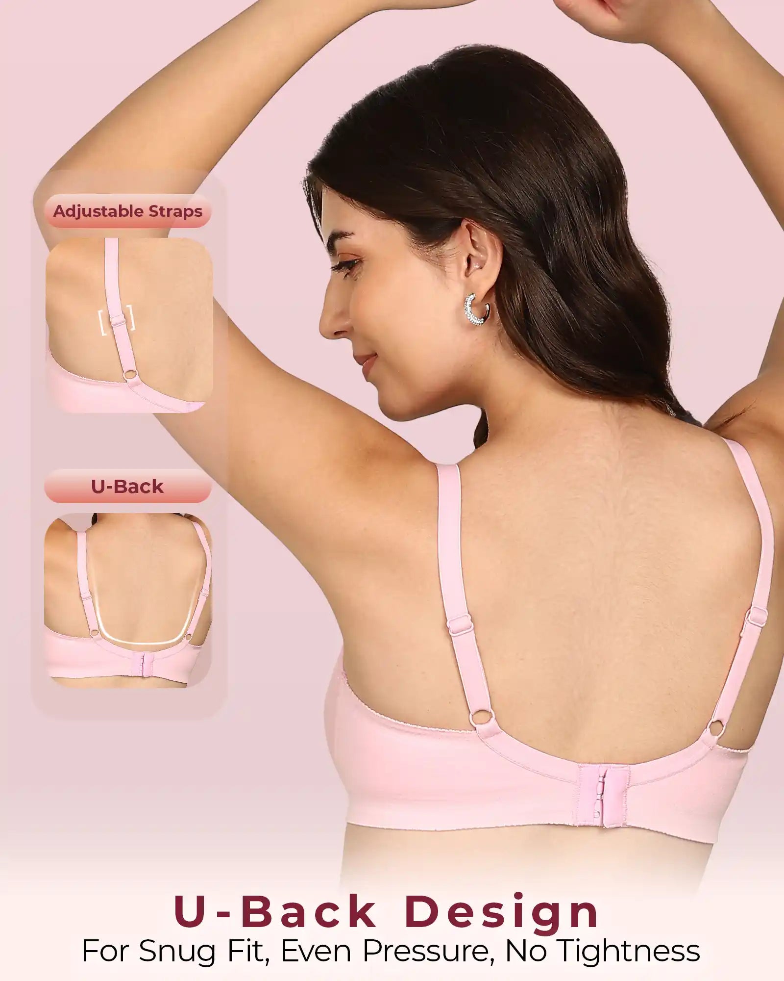 Broad Shoulder Straps: Wide straps distribute weight more evenly on the shoulders, reducing digging and discomfort – ideal for plus-size support and long wear.