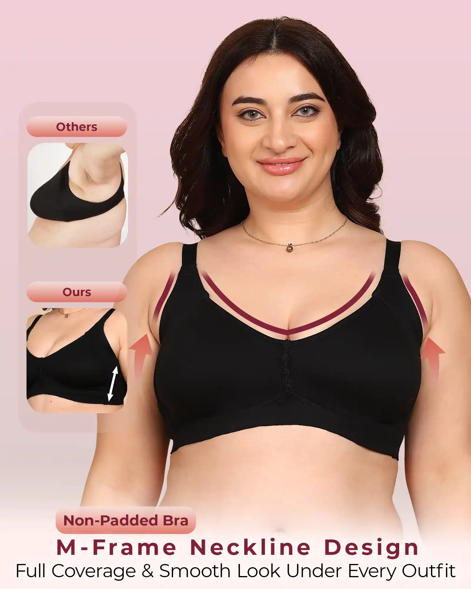 Natural Minimising M-Frame Design: The high-coverage M-frame neckline helps visually reduce the bust by up to one cup size, controlling spillage and creating a sleek, contained look under fitted outfits.