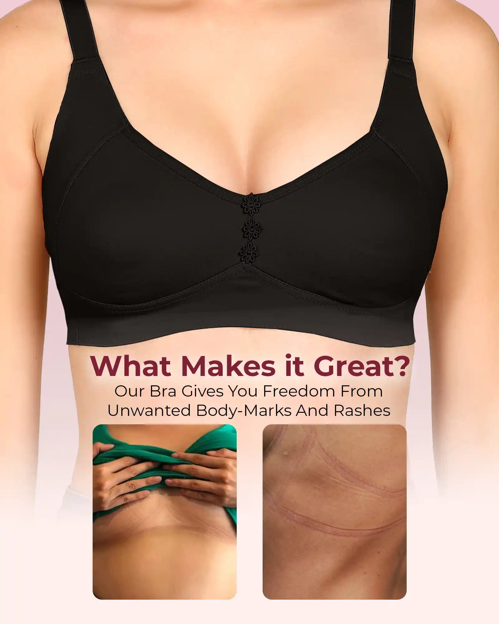 Elastic-Free Bottom Band: The underband is designed without harsh elastic so there’s no pinching, no tight body marks and no rashes—just soft, comfortable support around your ribcage.