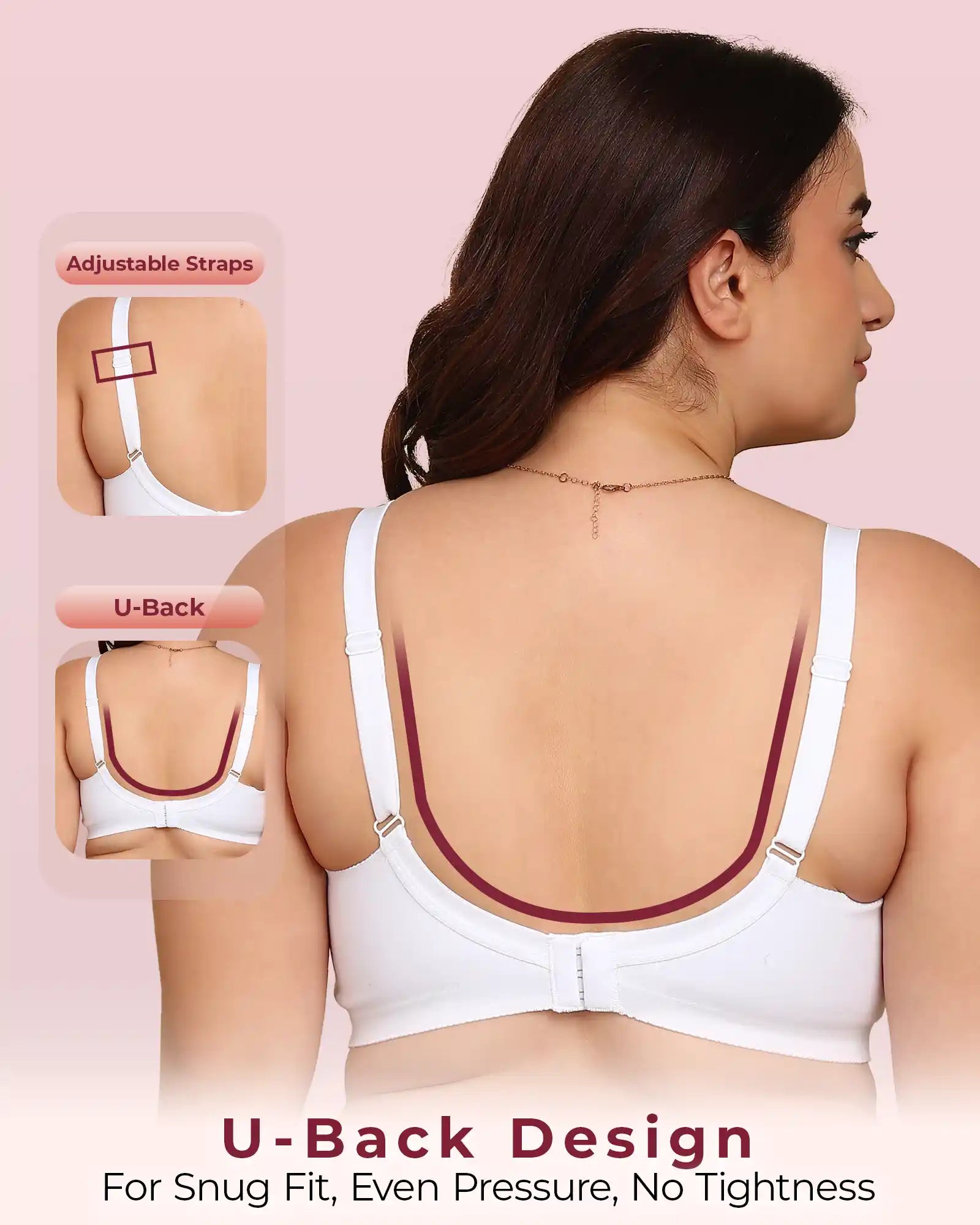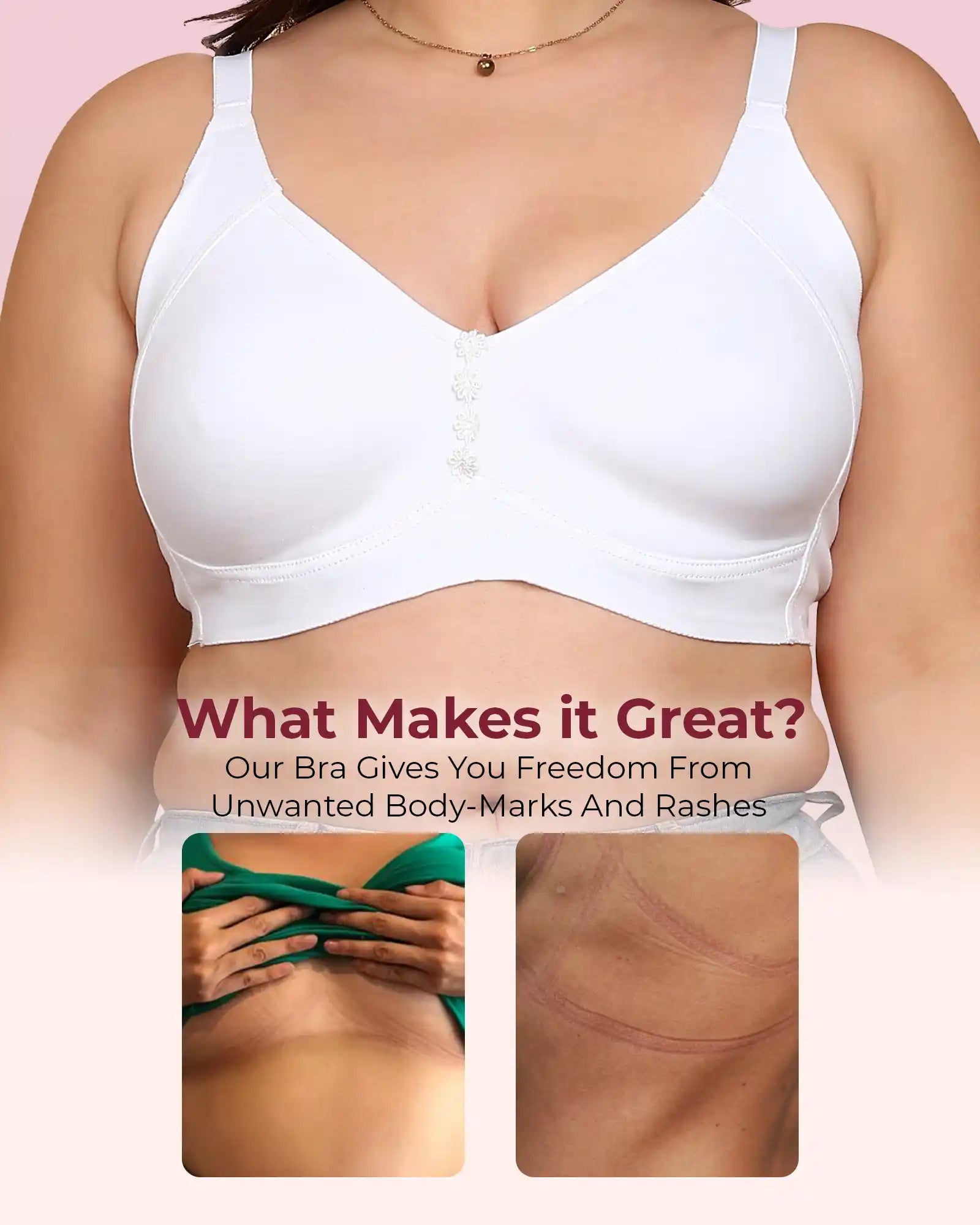 Elastic-Free Bottom Band: The underband is designed without harsh elastic so there’s no pinching, no tight body marks and no rashes—just soft, comfortable support around your ribcage.