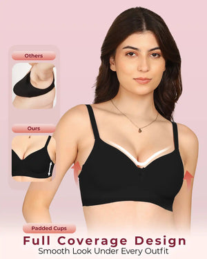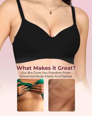 Meet your go-to bra for everyday confidence and comfort. Our Easy-Fit Padded Everyday Bra is crafted with stitch-free bonded technology for a smooth, invisible finish under fitted tops and tees. The lightly padded cups provide a natural lift and shaping while preventing show-through. Designed with an elastic-free bottom band and sidewings, it stays gentle on skin—no rashes, no red marks, no digging. Made from soft, breathable fabric, it feels like second skin while offering reliable all-day support. Perfect for work, casual outings, or lounging, this bra combines comfort, style, and invisibility in one everyday essential.