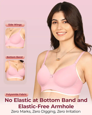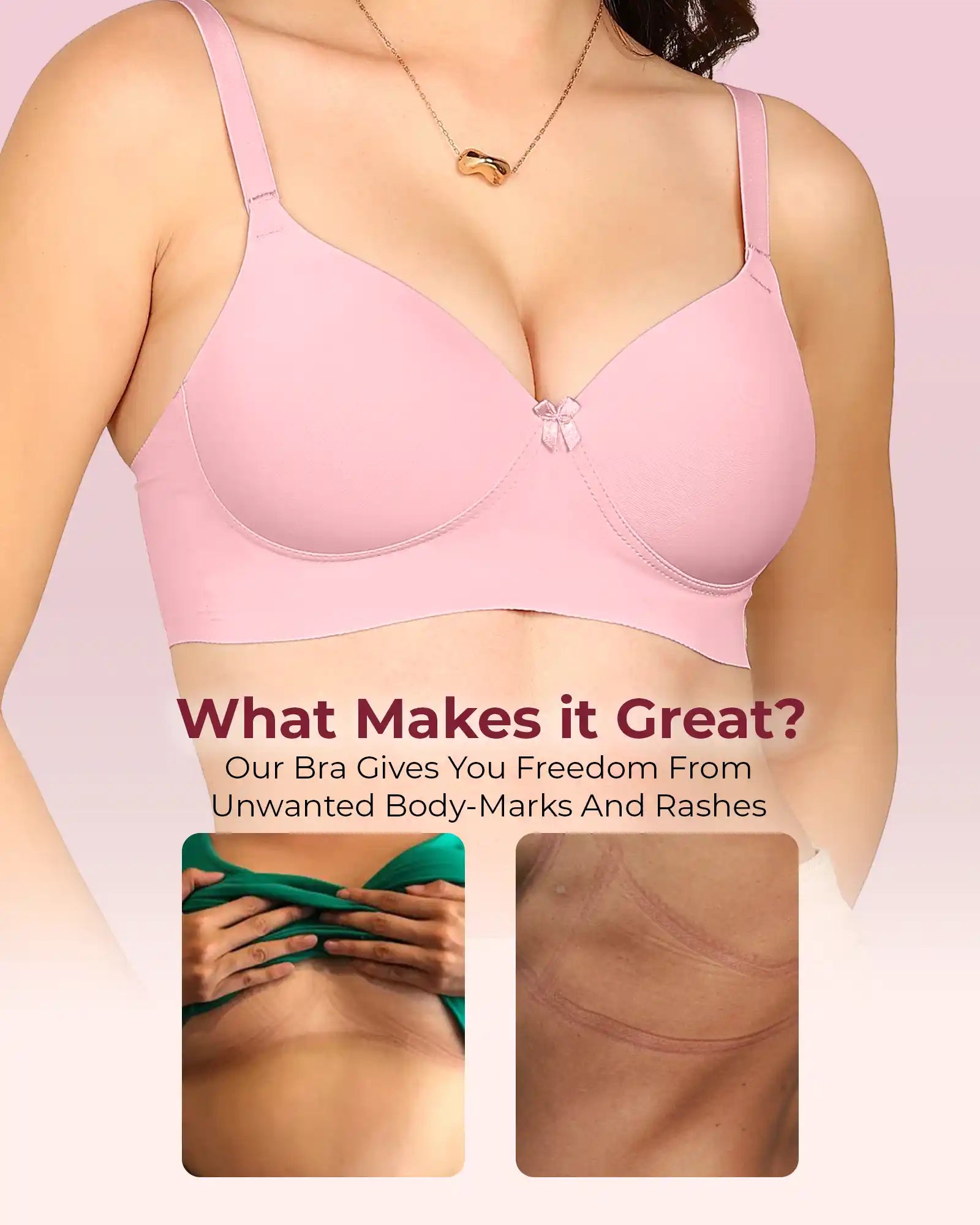 Meet your go-to bra for everyday confidence and comfort. Our Easy-Fit Padded Everyday Bra is crafted with stitch-free bonded technology for a smooth, invisible finish under fitted tops and tees. The lightly padded cups provide a natural lift and shaping while preventing show-through. Designed with an elastic-free bottom band and sidewings, it stays gentle on skin—no rashes, no red marks, no digging. Made from soft, breathable fabric, it feels like second skin while offering reliable all-day support. Perfect for work, casual outings, or lounging, this bra combines comfort, style, and invisibility in one everyday essential.